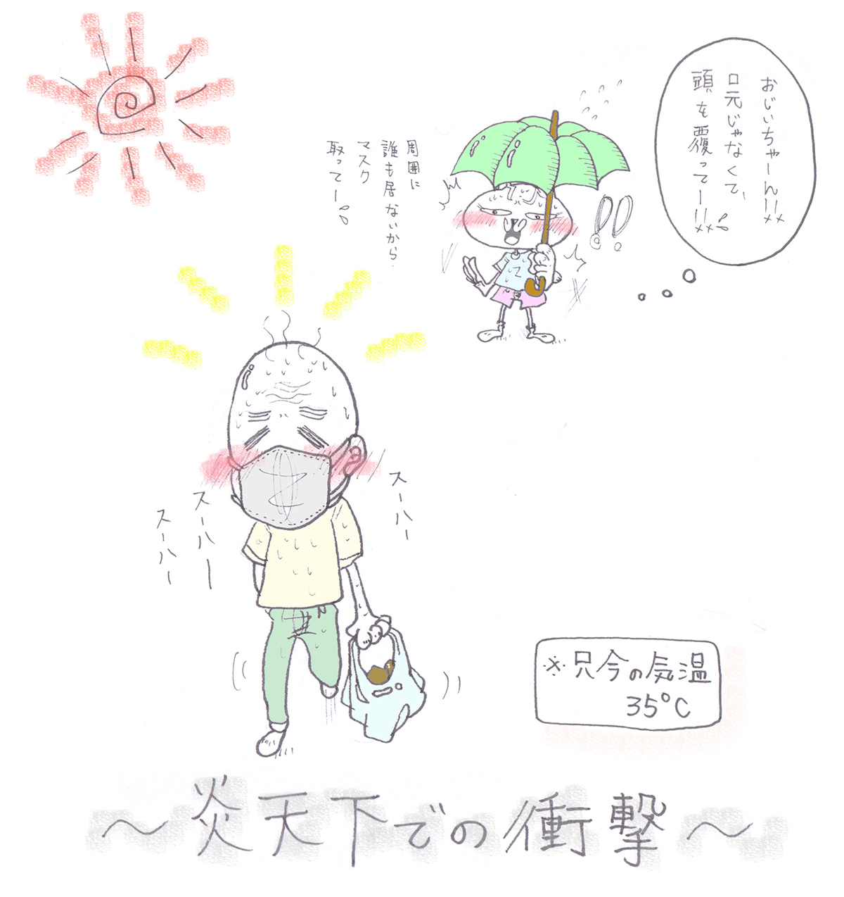 昨日、私は目撃したのです。 お昼ちょっと過ぎた35℃の炎天下で、 帽子も被らず、勿論日傘など刺さず、 しかし、口と鼻はすっぽりとマスクで覆われた状態で歩く、 頭部がツルツルのおじいちゃまを・・・。 しかも、二人。 「住宅街だから周りに誰も居ないよ〜。 お昼過ぎでほぼ日陰の無いアスファルトの上で、35℃だよ〜〜。 マスク取って〜〜。熱中症になっちゃうよ〜〜。 口と鼻じゃなくて、頭部を何かで覆って〜〜。」 と、心の中で叫んでしまいましたよね。 ・・・いやあ、なんかもう、 ある意味ホラー並みに恐ろしい光景でしたよ、ええ。 マスクを付けるのも大事ですが、熱中症には本当に注意ですよね・・・。 おまけ 話は全く関係無いのですが、 最近、セブンイレブンのビビンパにハ