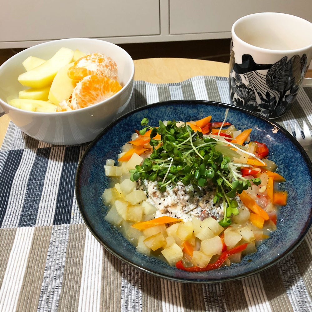 鶏ひき肉、人参、大根、パプリカ、貝割れ大根を使用した、 まるで地中海を思わせる様な彩りのリゾット風ご飯。 鰹節ベースのお出汁に、あらびき黒胡椒がピリリと効いてます。 加えて、デザートにりんごとみかん。 中央に生春巻き的な何かが乗せられたあったか麺。 鶏肉としめじともやしも見えます。 麺の上に乗せられていたのはこちら・・・。 鶏肉、しめじ、貝割れ大根、長葱、生姜等をライスペーパーで包んだお料理です。 レモン汁、味噌、バルサミコ酢、ごま油、生姜、黒胡椒を 和えたソースに付けて、頂きます〜♪ &nbs